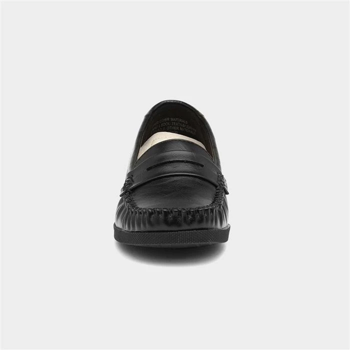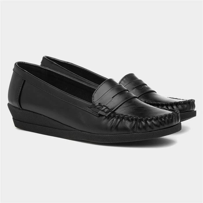 A failsafe way to complete any casual look. These womens black moccasin style casual shoes feature a round whip stitched toe, low wedge and a grip sole. They are perfect for creating a look that is smart yet casual. Style these with any type of trousers, formal dress or even skirts, they are simply versatile.